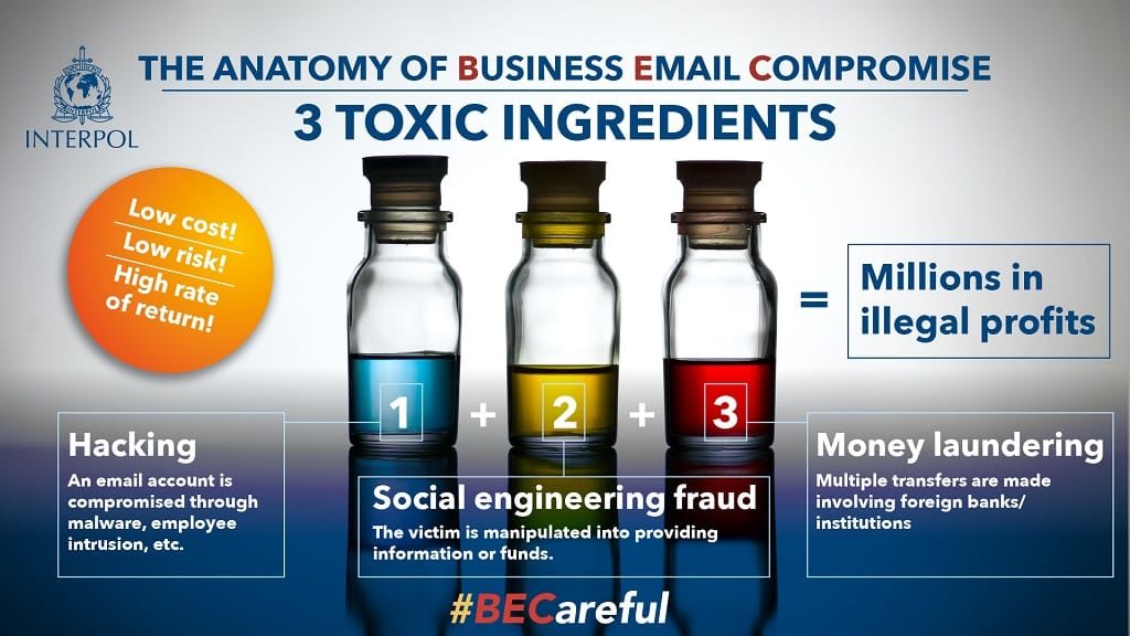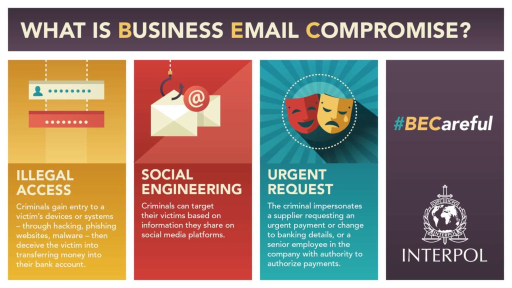 Criminals hack into email systems or use social engineering tactics to gain information about corporate payment systems, then deceive company employees into transferring money into their bank account.